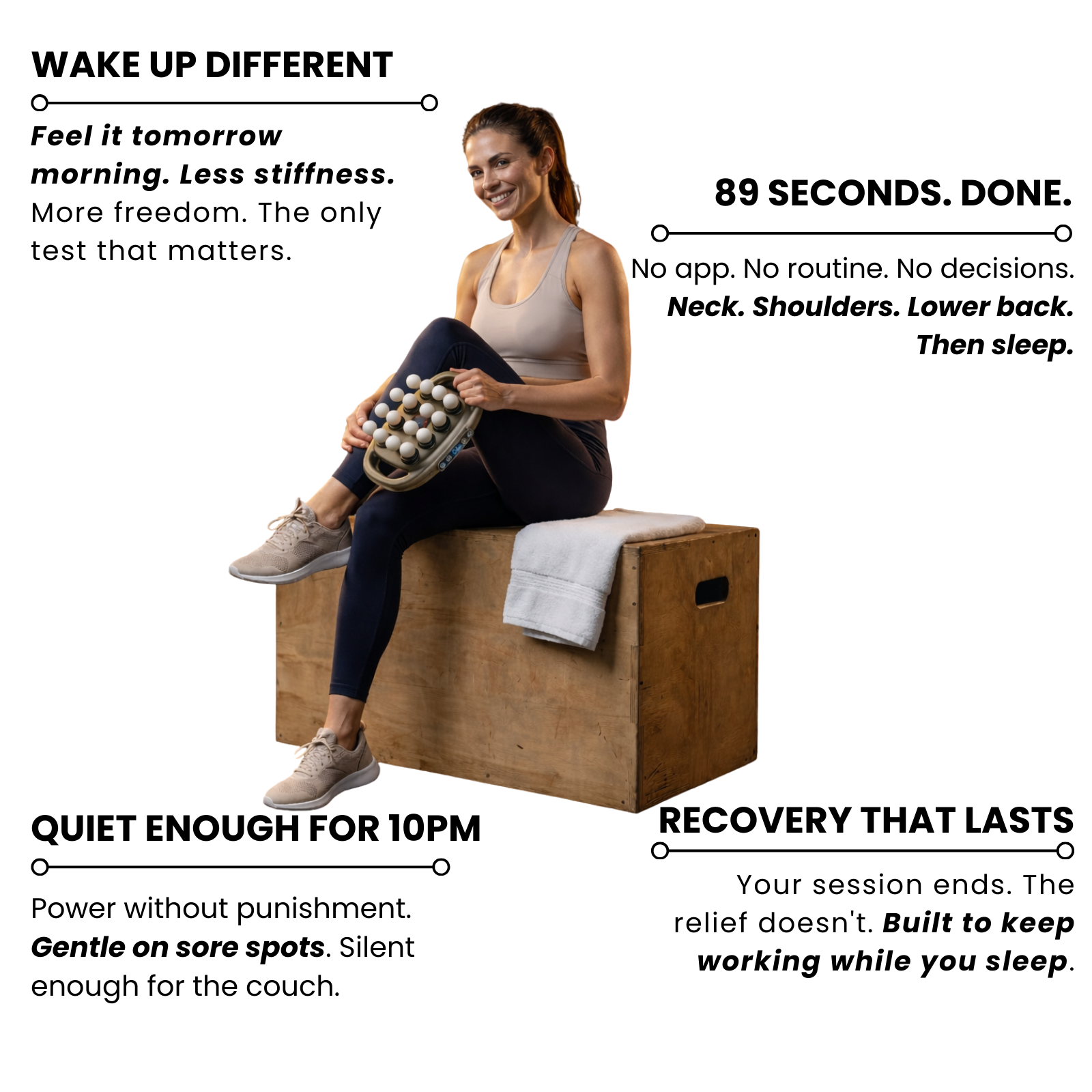 My massage gun is in a drawer. Not because it was bad — it just never held overnight. This is the first thing where I actually woke up different.